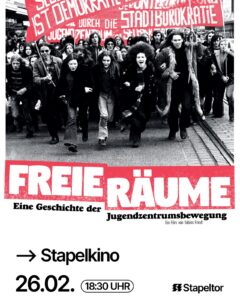 In Kooperation mit dem Archiv für alternative Schriften (Afas) und dem Stapeltor zeigen wir am 26.2.26 ebendort den Film „Freie Räume – eine Geschichte der Jugendzentrumsbewegung“. Dabei reisen wir zeitlich zurück in die Siebziger Jahre und zum JUZ Mannheim. Im Anschluss besprechen wir mit Eschaus-Mitgründer Helmut Loeven, wie er die Zeit in Duisburg erlebte.