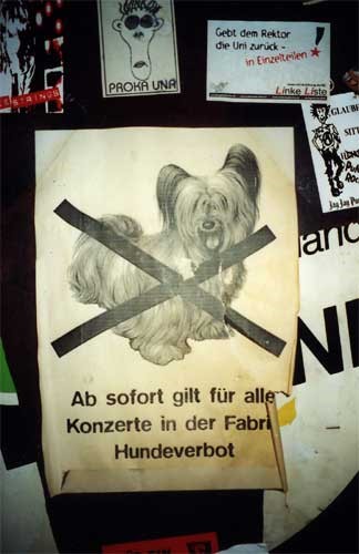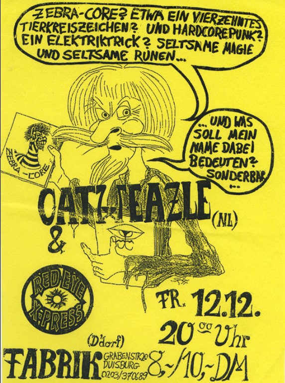 Hannes, ein damaliger Aktivist, erinnert sich im OX-Fanzine: „Los ging es mit Konzerte organisieren ab 1989. Der Typ, der das damals in der FABRIK in seinen Händen hatte, beschloss eines Tages, sich zurückzuziehen. Da sich niemand der Neuen dafür anbot und ich da zumindest neugierig war, habe ich mich gemeldet. Watt ´ne Kacke hatte ich da geerbt. Peter, mein Vorgänger hatte noch 3 Monate Programm gebucht, um Zeit für ´nen Übergang zu schaffen. Dann hat er mir drei Kartons mit Demotapes hingestellt und gesagt: „Hör mal an und such was aus“. Himmel hilf, drei Kisten Müll und ich soll Programm buchen? Eine Bluesband nach der anderen oder noch schlimmere Verbrechen.“ Das erste Punkkonzert in der Fabrik fand dann mit der Duisburger Band „Dödelhaie“ statt.