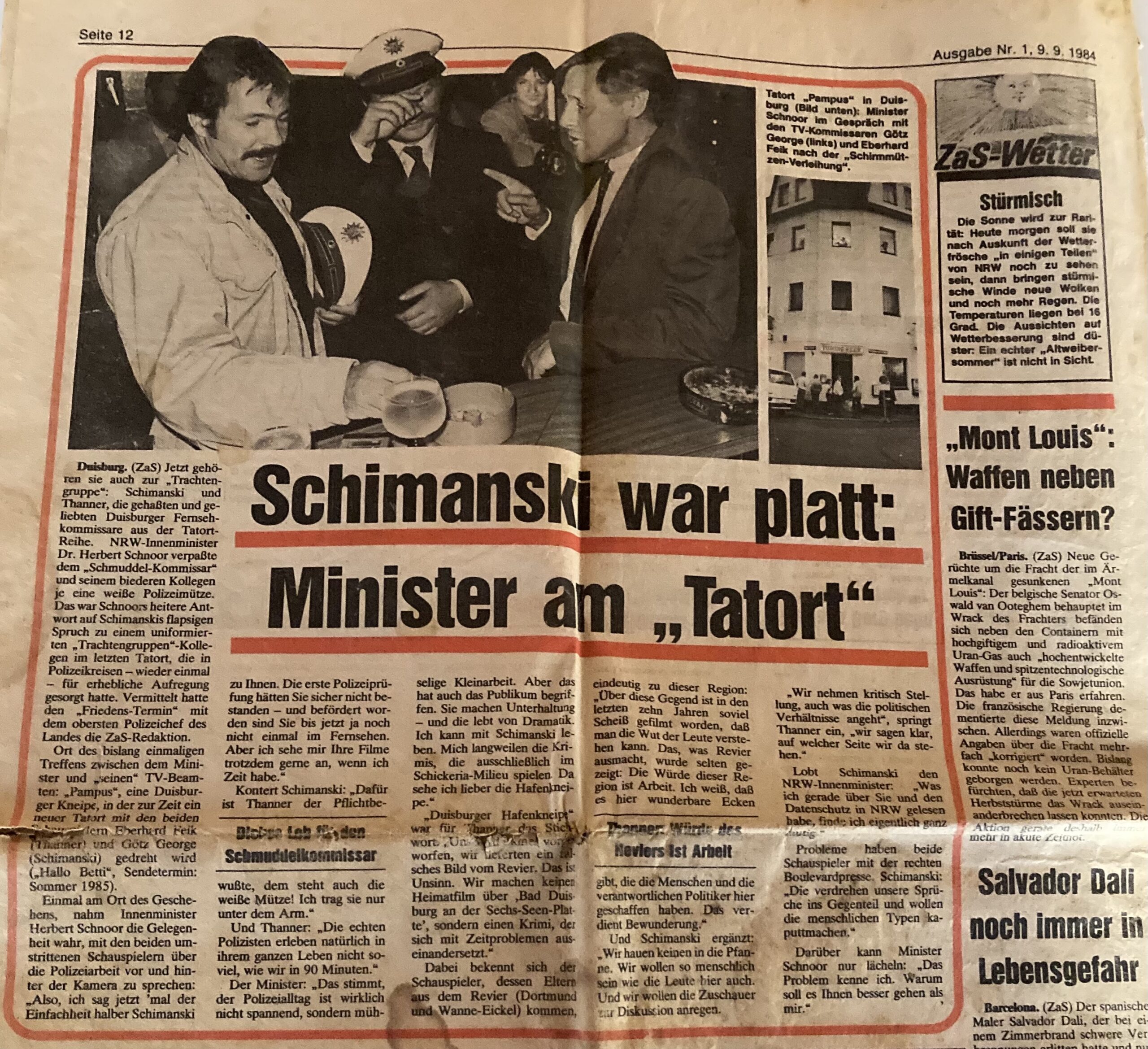 1984 wurde das Pampus dann selber Drehort – in einem Schimanski-Tatort natürlich. Die Bavaria Atelier GmbH versicherte in der Vereinbarung die Dreharbeiten mit der notwendigen Sorgfalt durchzuführen. Hat geklappt, wie sich auch der damalige Innenminister beim Treff mit Götz George und Eberhard Feik versicherte.