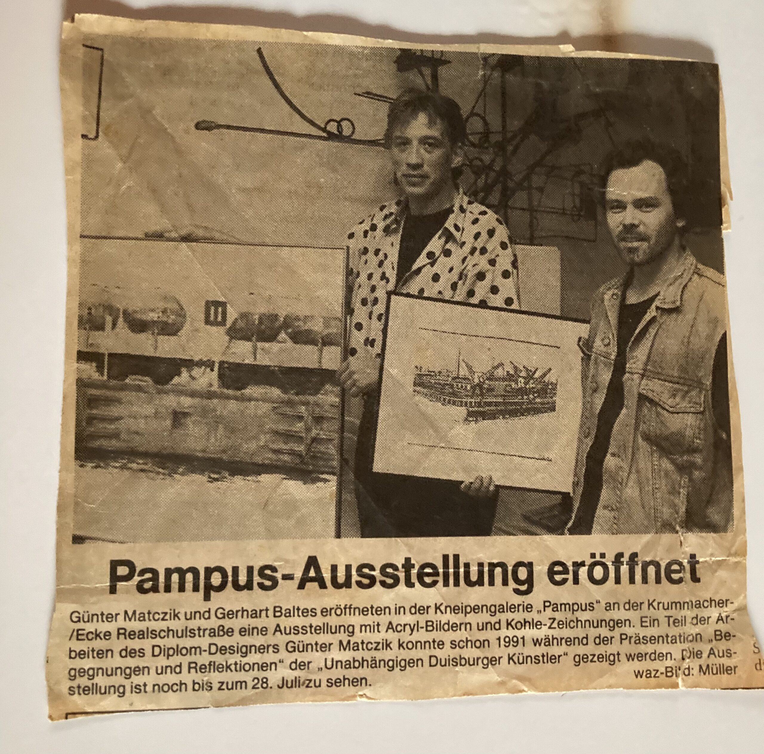 Aus den Achtzigern stammen diverse Kunstwerke wie auch eine große Skulptur von Dieter Pirdzun, dem 1988 eine Ausstellung posthum gewidmet war. Viele weitere lokale Künstler:innen, wie Arndt, Müller, Grundei oder Lipka und Koukouwitakis stellten gerne im Lokal aus, wie ein Blick ins Gästebuch und an die Wände verrät. Organisiert wurden die häufig von Günter Matczik, dessen Zeichnungen von Mary und Gästen wiederum das Thekenregal zieren. Auch nicht erst seit gestern.